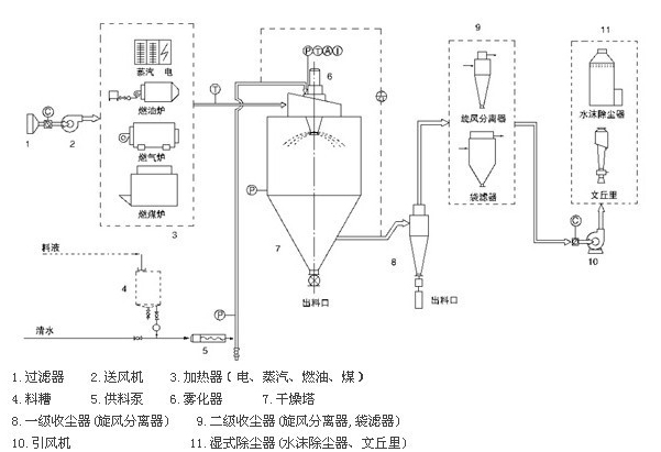 空氣通過過濾器和加熱器,進入干燥器頂部的空氣分配器,熱空氣呈螺旋狀均勻進入干燥器。料液由料液槽經(jīng)過濾器由泵送至干燥器的離心霧化器,使料液噴成績效的霧狀液滴,料液和熱空氣并流接觸水分迅速蒸發(fā),在短時間內(nèi)干燥為粉末狀成品。成品由于干燥塔地步和旋風(fēng)分離器排除,廢棄由風(fēng)機排出。